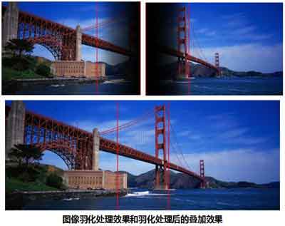 融合帶的羽化處理是將兩個(gè)投影機(jī)投射畫面的重疊部分,分別做圖像強(qiáng)度的連續(xù)而非線性變化,讓兩個(gè)投影機(jī)投射的畫面重疊部分圖像強(qiáng)度與融合帶兩側(cè)沒有經(jīng)過(guò)重疊部分的圖像強(qiáng)度相一致, 產(chǎn)生色彩一致的融合畫面。